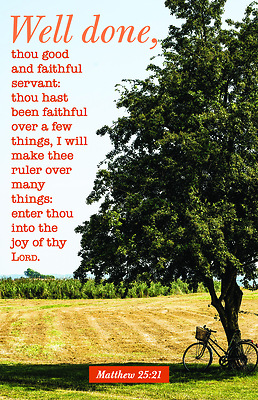 Funeral Bulletin is adorned with a beautiful 4-color image, and is designed for use during a Funeral celebration service any time of the year. The featured verbiage is Matthew 25:21 from the KJV translation of the Bible.